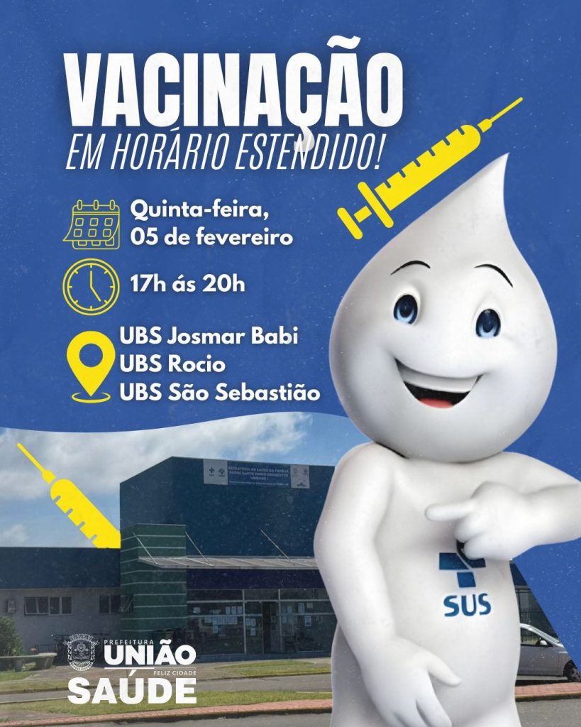 As UBS do bairro São Sebastião, do centro e do Rocio estarão abertas até as 20h Com o objetivo de ampliar a cobertura vacinal no município, as Unidades Básicas de Saúde (UBSs) do São Sebastião, Josmar Babi, do centro e